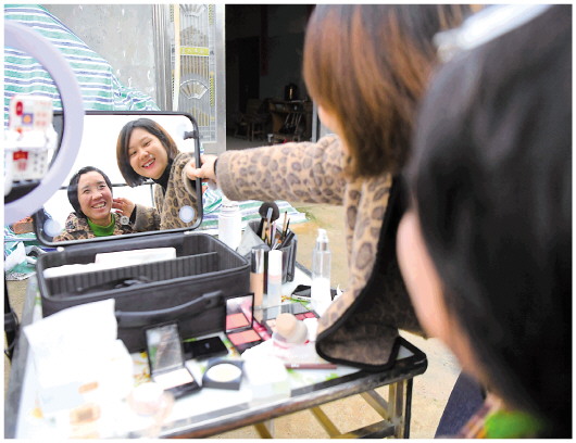 2020年春节,受新冠肺炎疫情的影响,复工较晚,一直在老家的周文娟终于将想法变成了现实。她为村里的阿姨们免费化妆,并用视频记录阿姨们妆前妆后的变化。令她意想不到的是,视频发到网上后,在多个社交媒体平台登上热搜。之后,不少附近的年轻人找到周文娟,希望她也能为自己留守农村的母亲带来化妆初体验。至今,周文娟已经为周边的50多名农村女性免费化妆造型。“很多农村女性一生为家庭操劳,很少关注自己。我希望在帮她们化妆的过程中,她们能发现自己的美、做自己的主角。”周文娟说。新华社记者薛宇舸摄