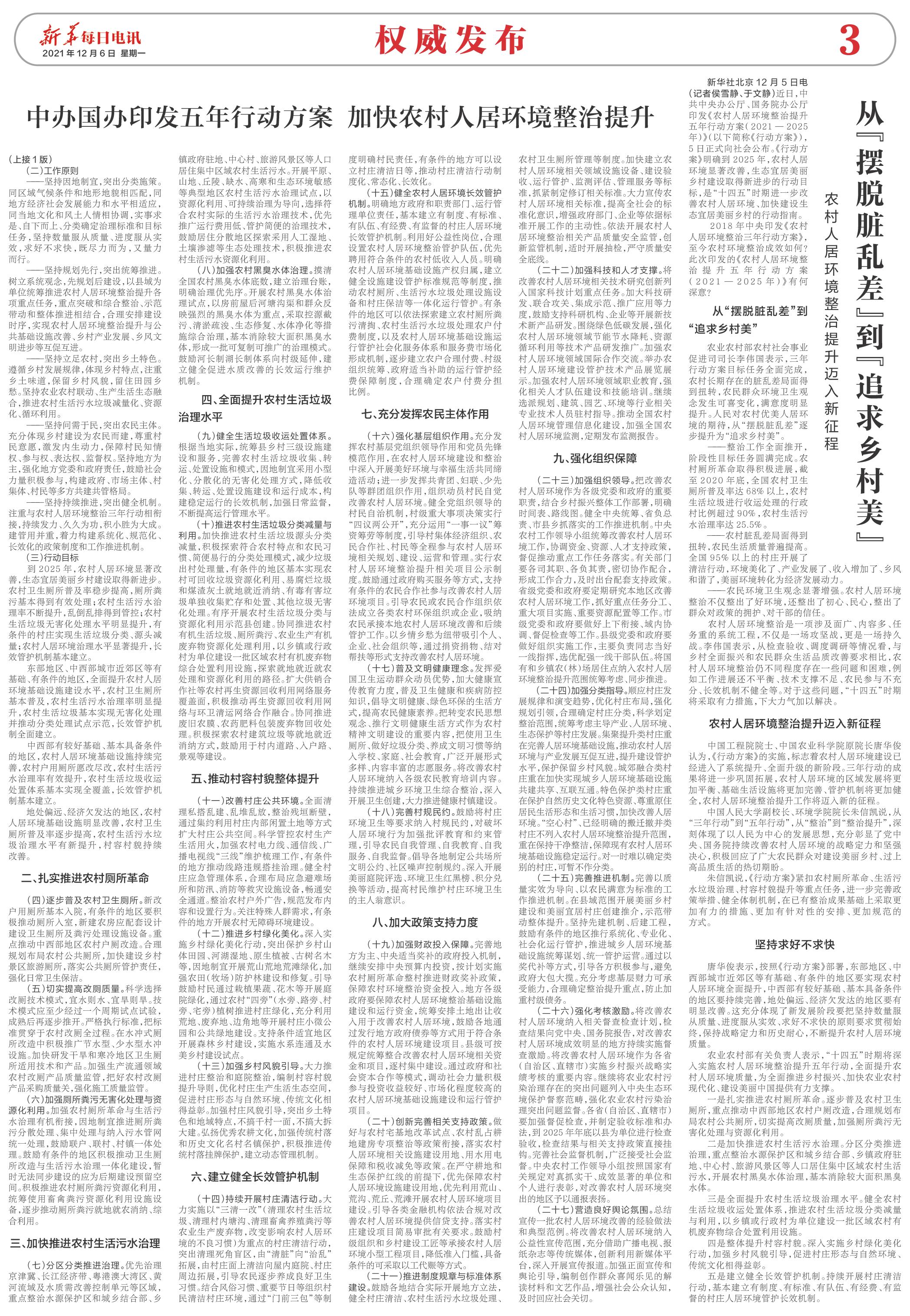 新华社北京12月5日电(记者侯雪静、于文静)近日,中共中央办公厅、国务院办公厅印发《农村人居环境整治提升五年行动方案(2021—2025年)》(以下简称《行动方案》),5日正式向社会公布。《行动方案》明确到2025年,农村人居环境显著改善,生态宜居美丽乡村建设取得新进步的行动目标,是“十四五”时期进一步改善农村人居环境、加快建设生态宜居美丽乡村的行动指南。