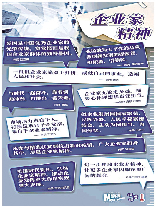 从全面抗战到全力抗疫,再到脱贫攻坚、决胜全面建成小康社会,历史奔腾向前,企业家精神历久弥新,持续迸发出强大力量。