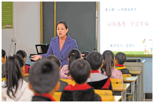这堂课的主题是“感恩”,听课的有学生,还有几位爷爷奶奶。作为永州市蓝山县楠市中心小学的校长,盘晓红设计的德育思政类课程“美心课”不仅教育学生,也吸引了不少家长。