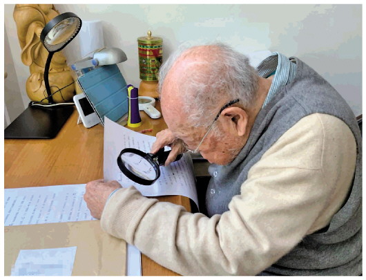 时间回溯到今年1月22日。我去向社长黄立新汇报刚谈定的一图书项目时,他正准备去马老家拜访,于是带我一同前往。一走进大门,就看到马老坐在书桌前,手上拿着放大镜,十分专注地看书。那天春光明媚,阳光从窗外洒进来,满屋生辉。窗户上贴着马老挥毫书写、喜气洋溢的“福”字,苍劲有力,烂漫天真;窗外,黄色的蜡梅傲然怒放,馥郁芬芳。坐定后,马老兴奋地跟黄社长聊起西南联大中文系那些事儿,聊罗常培、唐兰、王力、陈梦家等先生,让人感觉70多年前的校园往事仿佛就在昨天。马老完全不像107岁的老人,尤其是谈起他在西南联大的求学经历时,声如洪钟,中气十足。那个时候你会突然觉得时间好像凝固了一般,你的思绪会跟着马老的讲述走,有一种穿越到了当年西南联大课堂上的感觉,仿若在亲耳聆听唐兰等大师讲授甲骨文等古文字学。
