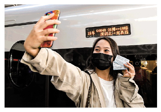 12月10日,乘客准备搭乘深圳北站开往南昌西站的首班列车时,在车厢外自拍留影。 新华社记者毛思倩摄 |
