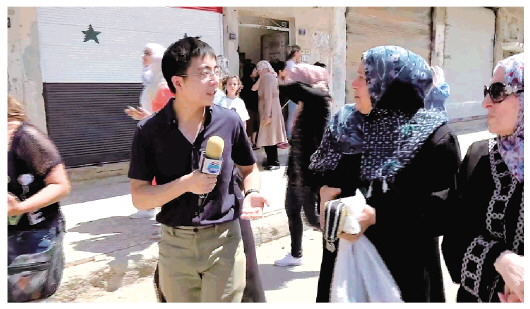 新华社驻叙利亚大马士革记者汪健在大马士革街头采访。 新华社发