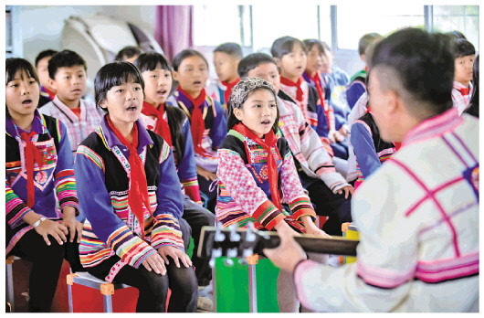 12月13日,学生在基诺山基诺族乡民族小学音乐课上唱歌。基诺山基诺族乡民族小学位于云南省西双版纳傣族自治州景洪市,在这里就读的学生大多数是基诺族。近年来,为更好传承基诺族文化,该校在音乐教学中结合民族特色,将基诺族鼓歌与手鼓等乐器相融合,还把学生应该遵守的行为规范自编自创为歌曲传唱,受到同学们的欢迎。 新华社记者陈欣波摄