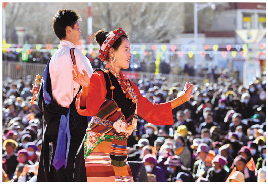 在西藏康马县2021年产业竞赛暨冬季物资交流会开幕式上,当地演员在表演节目(12月10日摄)。当日,为期5天的西藏康马县2021年产业竞赛暨冬季物资交流会开幕。来自西藏各地的400余家参展商和当地的农牧民专业合作社,为人们提供了物美价廉的商品。 新华社记者张汝锋摄