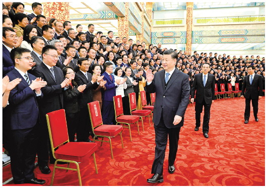 下午3时10分,习近平等来到人民大会堂金色大厅,全场响起热烈掌声。习近平等走到代表们中间,同大家亲切交流并合影留念。