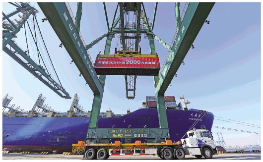 12月18日,天津港2021年第2000万标准箱被吊装至中远海运“天盛河”轮。当日,天津港年集装箱吞吐量首次突破2000万标准箱,创历史新高。据介绍,天津港今年新开通内外贸航线10条,同全球200多个国家和地区的800多个港口有贸易往来,其中与“一带一路”沿线港口贸易货物在总吞吐量中占比超过六成。