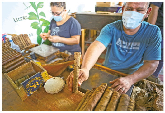 12月16日,工人在尼加拉瓜格拉纳达省的一家雪茄工厂展示雪茄半成品。