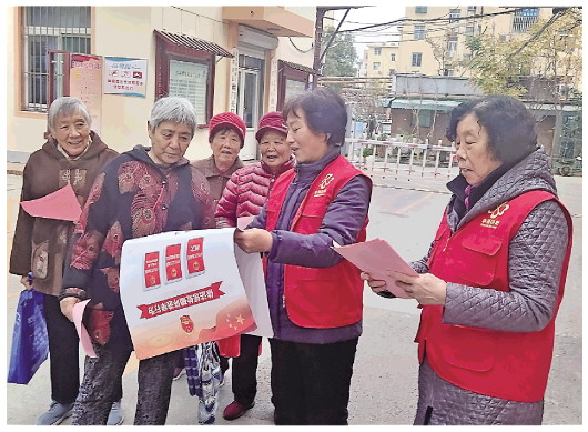 11月29日,山东省济宁市任城区济阳街道楼长给居民宣传人大换届选举有关知识。新华社发(孙艳摄) |