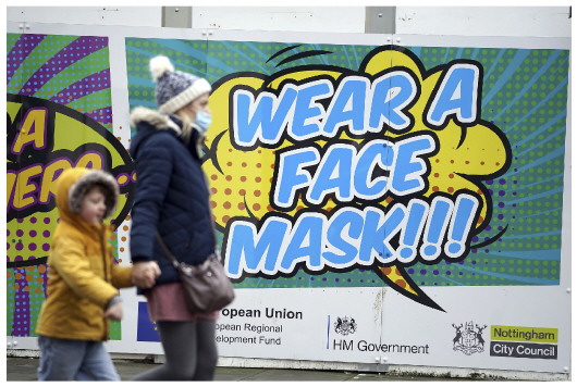 12月20日,人们在英国诺丁汉经过防疫提示牌。截至20日,英国累计报告奥密克戎毒株感染病例45145例。