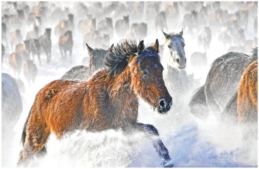 在新疆昭苏县,骏马在雪原上奔驰。 新华社发(李文武摄)