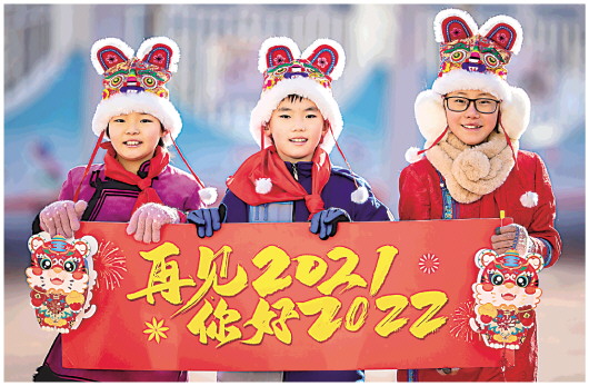 二〇二一年十二月三十一日,内蒙古呼和浩特市玉泉区南柴火市街小学学生手持“再见2021,你好2022”字样,喜迎新年。 新华社发(丁根厚摄)