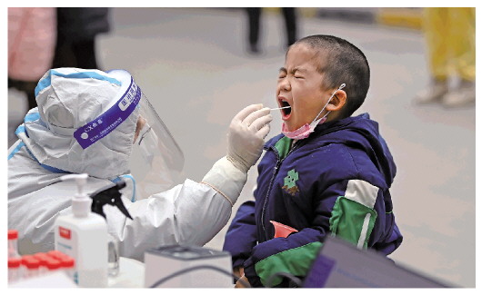 1月4日,小朋友在西安市新城区新民社区进行核酸采样。