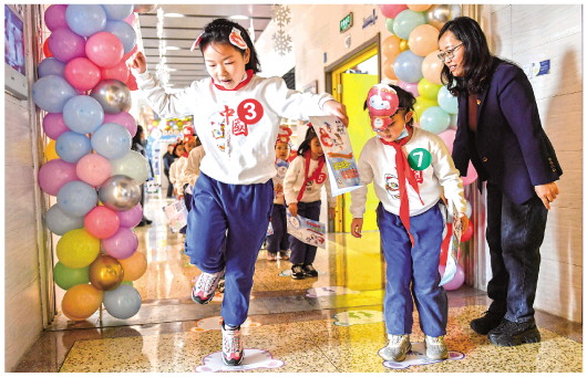 “我们觉得很好玩,中间要跳脚印、转大转盘,就像是闯关做游戏。”二年级2班的学生崔紫芊说,这次感觉不像原来的纸笔考试那么累,虽然完成“闯关”需要做一系列运动,但带来的却是放松、愉悦的感觉。