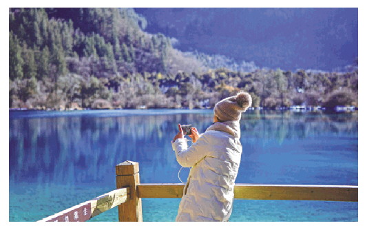 一名游客在九寨沟景区火花海前拍照。隆冬时节,世界自然遗产九寨沟景区呈现迷人的冬季风光。 新华社记者张超群摄