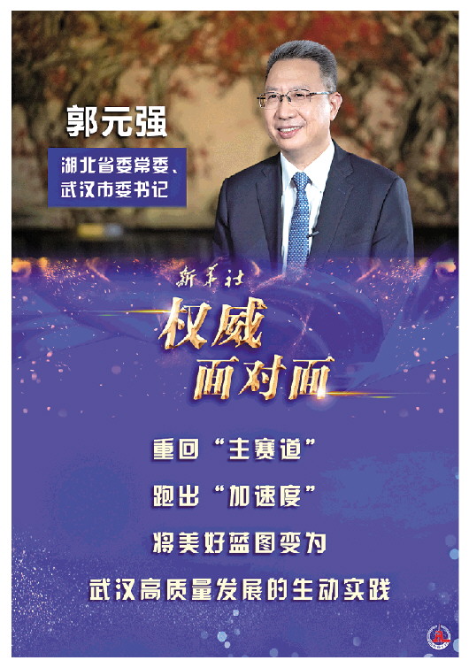 在取得疫情防控武汉保卫战决定性成果后,作为建设中的国家中心城市和长江经济带核心城市,贯彻中央经济工作会议精神,武汉经济发展重回“主赛道”后如何跑出“加速度”?如何在国家区域发展格局中发挥重要作用?如何发挥科教优势引领创新发展?新华社记者专访了湖北省委常委、武汉市委书记郭元强。