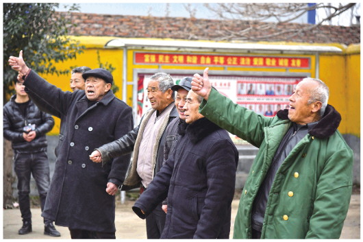 1月12日,在山东省莘县张寨镇郝庄村,“大爷帮”老人们为拍摄短视频进行排练。