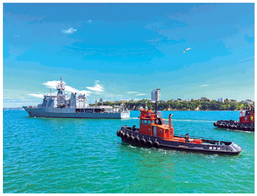 ▲1月18日,新西兰海军惠灵顿号舰(左)从位于奥克兰的德文波特军港启航前往汤加。新西兰国防部18日说,新西兰海军两艘救援舰已于当天出发前往汤加,准备向汤加提供以淡水为主的救援物资。 新华社发(新西兰国防部供图)
