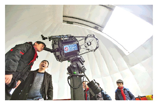 小图左:1月19日,学生(左一)在星河天文台工作人员的指导下体验天文望远镜。