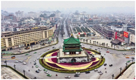 西安已有17个区县、开发区有序恢复生产生活秩序。图为西安市钟楼盘道再现车水马龙的景象(1月22日摄)。