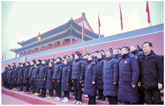 ▲1月25日,中国体育代表团部分成员在升国旗仪式上。当日,北京冬奥会中国体育代表团部分成员来到天安门广场观看升国旗仪式,并宣誓出征。 新华社发(国家体育总局冬季运动管理中心供图)