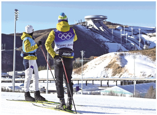 在国家越野滑雪中心,运动员在训练间隙休息(1月27日摄)。国家越野滑雪中心位于崇礼冬奥核心区古杨树场馆群的东南侧山谷。北京冬奥会期间,国家越野滑雪中心将承担越野滑雪和北欧两项部分比赛。目前,该场馆所有准备工作就绪,静待冬奥会开赛。