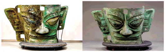 拼版照片:左图是在四川省文物考古研究院三星堆考古研究所拍摄的三星堆遗址3号“祭祀坑”出土的青铜大面具(2021年9月3日新华社记者王曦摄);右图是修复完成的青铜大面具(四川省文物考古研究院、三星堆博物馆供图)。 新华社发 |