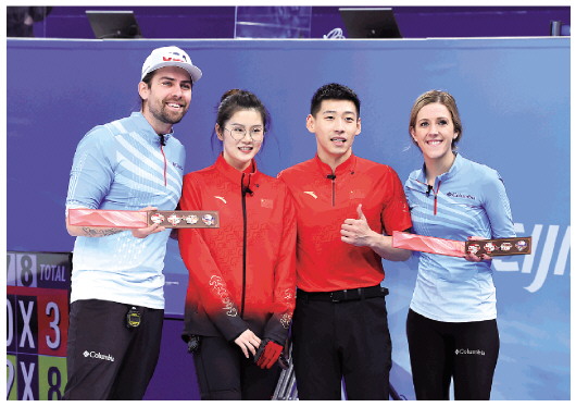 美国队克里斯托弗·普利斯和维多利亚·珀辛格惊喜接过徽章,细细端详。普利斯将徽章放在身前展示,示意两队面向摄影记者合影留念。