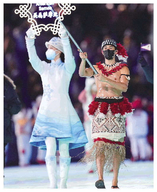 新华社北京延庆2月7日电(记者张骁)在北京冬奥会开幕式上,美属萨摩亚旗手纳森·克鲁姆普顿无惧严寒,以赤膊涂油、身套草裙、脚踩人字拖的“清凉装扮”亮相。开幕式后,他被中外观众戏称为“冬奥会最扛冻的旗手”。