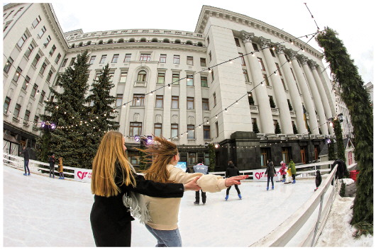 2月10日,在乌克兰基辅的总统办公大楼前,市民在为迎接新年临时搭建的滑冰场上滑冰。