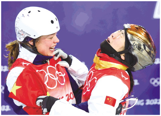▲2月14日,中国选手徐梦桃(右)与美国选手阿什莉·考德威尔相互拥抱。当日,北京2022年冬奥会自由式滑雪女子空中技巧决赛在张家口云顶滑雪公园举行,中国选手徐梦桃夺得冠军。 新华社记者费茂华摄