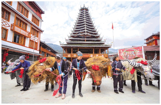 2月4日,在广西龙胜县平等镇广南村,人们举行闹春牛、春牛巡游祈福等民俗活动庆祝立春的到来。 新华社发(黄勇丹摄) |