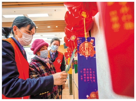 2月15日,徐州站“无线网”青年志愿服务队志愿者在活动上与老人一起猜灯谜。当日是元宵节,中国铁路上海局集团有限公司徐州站“无线网”青年志愿服务队来到徐州市泉山区,开展“助老服务迎元宵”活动。 新华社记者李博摄