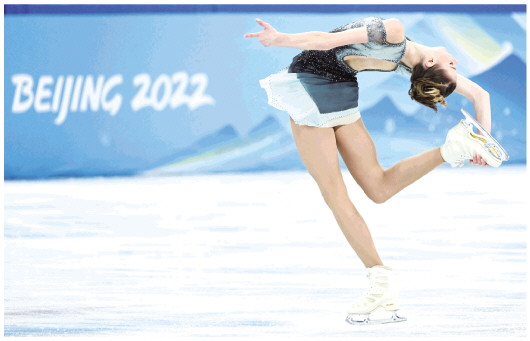 二月十五日,白俄罗斯选手维多利亚·萨福诺娃在花样滑冰女子单人滑短节目比赛中,场馆围挡的设计灵感来自名画《千里江山图》。 新华社记者马宁摄