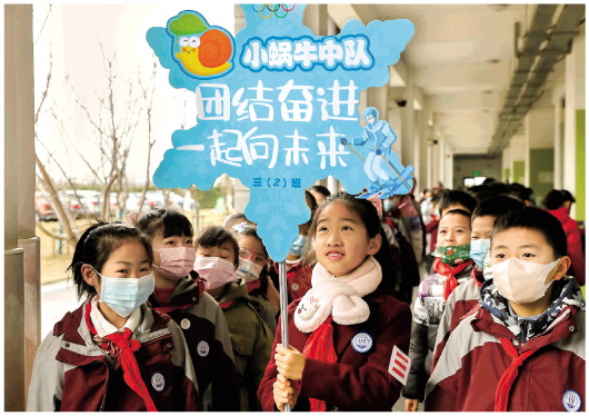2月17日,学生们举着带有冬奥元素的班级牌准备参加开学典礼。