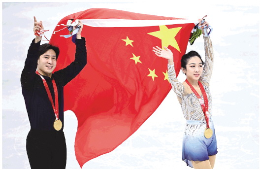 二月十九日,中国选手隋文静(右)/韩聪在奖牌颁发仪式后。当日,北京冬奥会花样滑冰双人滑自由滑比赛在首都体育馆举行,中国选手隋文静/韩聪夺得双人滑冠军。