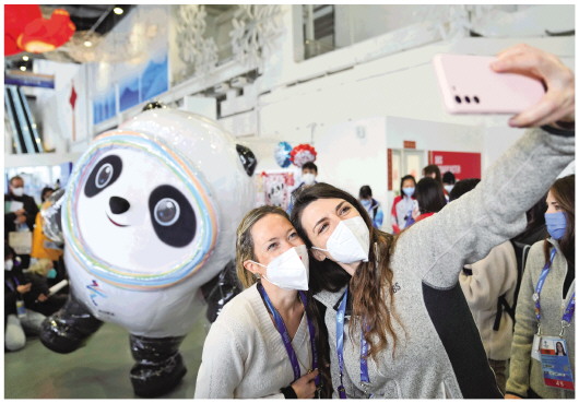 ▲2月12日,北京冬奥会主媒体中心举办集体采访活动,现场观众与北京2022年冬奥会吉祥物“冰墩墩”自拍。新华社记者鞠焕宗摄