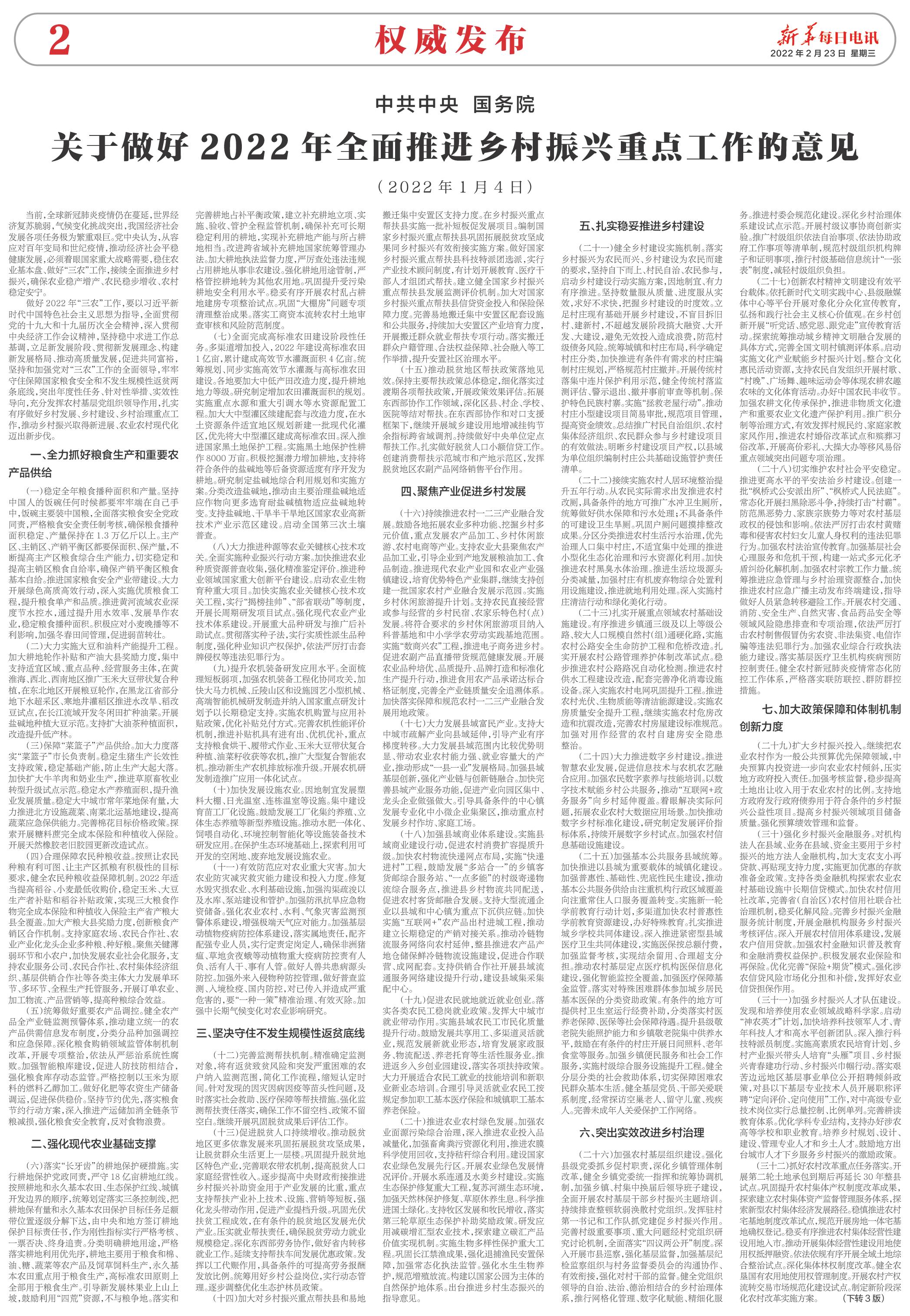 关于做好2022年全面推进乡村振兴重点工作的意见 |