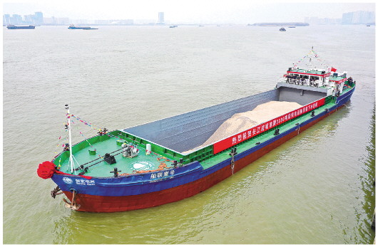 ▲2月22日,“船联1号”电动货船在长江南京段航行。当日,长江流域首艘3000吨级纯电动货船“船联1号”在南京首航。该船由原来总载重3000吨位的燃油货船改造而成,把电能作为整艘船的唯一能源,实现零排放、低噪音、无污染。 新华社记者李博摄