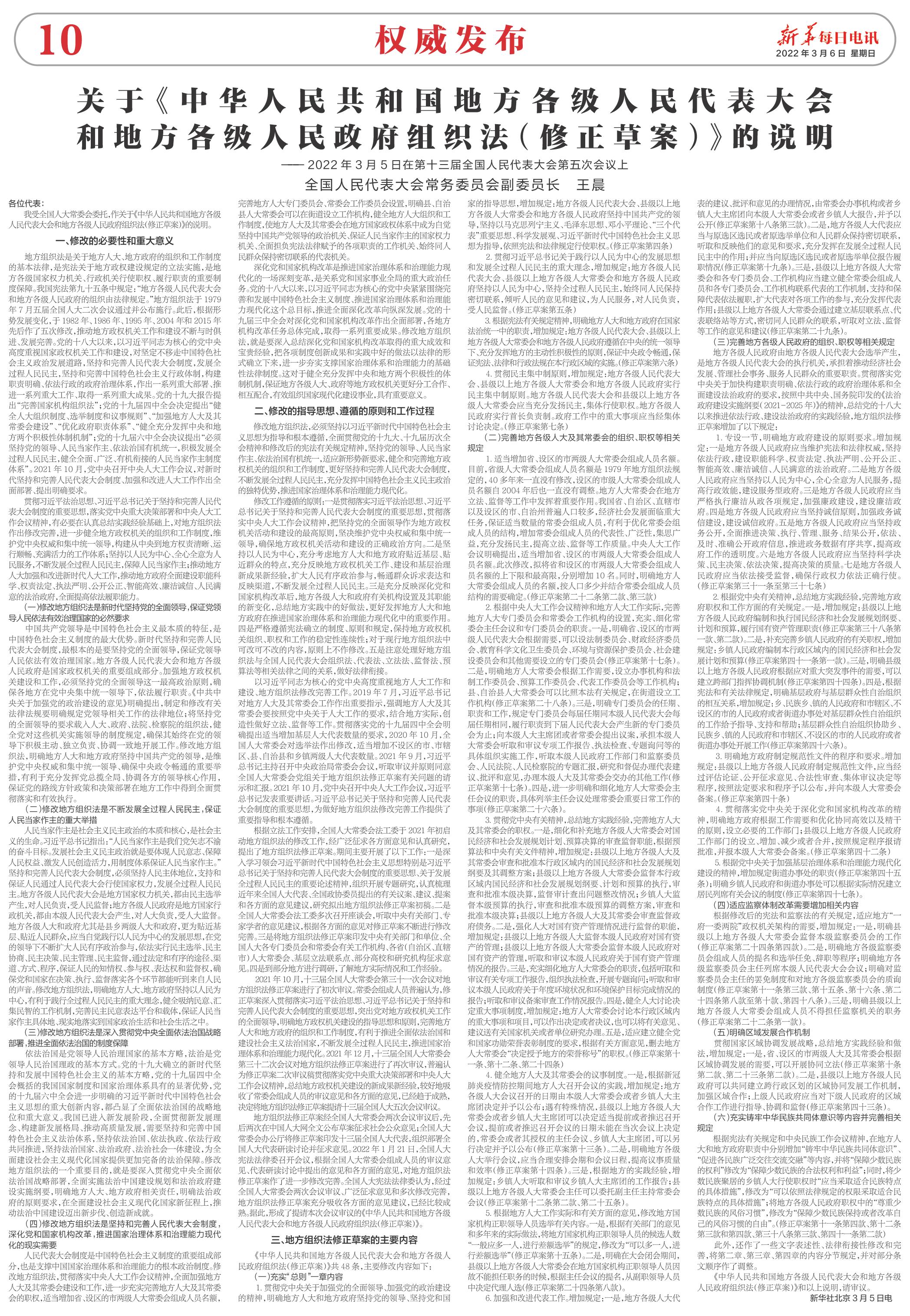 地方组织法修正草案经全国人大常委会两次会议审议后,先后两次在中国人大网全文公布草案征求社会公众意见;全国人大常委会办公厅将修正草案印发十三届全国人大代表,组织部署全国人大代表研读讨论并征求意见。2022年1月21日,全国人大宪法法律委召开会议,根据全国人大常委会组成人员的审议意见、代表研读讨论中提出的意见和各方面的意见,对地方组织法修正草案作了进一步修改完善。全国人大宪法法律委认为,经过全国人大常委会两次会议审议、广泛征求意见和多次修改完善,地方组织法修正草案充分吸收各方面的意见建议,已经比较成熟。据此,形成了提请本次会议审议的《中华人民共和国地方各级人民代表大会和地方各级人民政府组织法(修正草案)》。