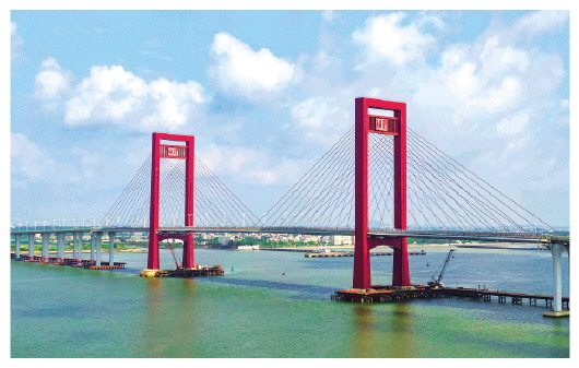 2021年5月4日拍摄的湛江调顺跨海大桥(无人机照片)。大桥跨越湛江湾连接湛江市调顺岛及海东新区,对加快广东粤西片区经济发展发挥重要连通作用。新华社发(杨凝摄) |