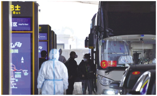 3月19日,乘坐临时航班抵达长沙黄花国际机场的中国公民准备前往隔离酒店。当日早上6时45分,第十七架接返自乌克兰撤离中国公民临时航班安全抵达长沙。 新华社记者陈振海摄