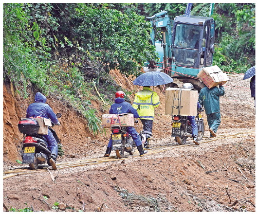 3月23日,村民、志愿者往坠机事故救援现场搬运物资。当日,受连续降雨影响,藤县空难事故现场附近道路泥泞湿滑,由附近村民、志愿者等人员组成的摩托车车队在阴雨天气下自发为搜救人员运送救援物资。新华社记者周华摄