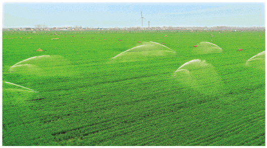 ▲在河南省周口市商水县张庄乡高标准农田示范区,水肥一体机在为麦田浇灌(3月22日摄)。