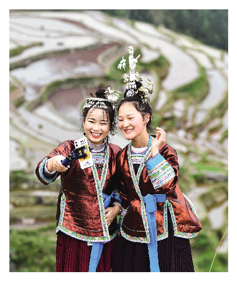 在贵州从江县加榜乡加车村,脱贫攻坚指挥所网格员吴贤艳(左)与村里的女大学生梁琼英在直播推介加榜梯田风光(2020年4月19日摄)。 新华社记者杨文斌摄