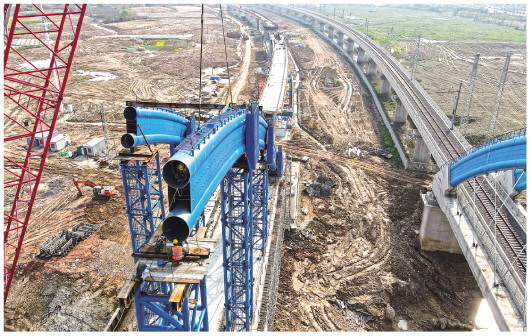 ▲3月28日,工人在中铁四局引江济淮工程江淮沟通段合九铁路改建工程施工现场作业(无人机照片)。引江济淮工程沟通长江、淮河两大水系,是我国跨流域、跨省重大战略性水资源配置和综合利用工程。