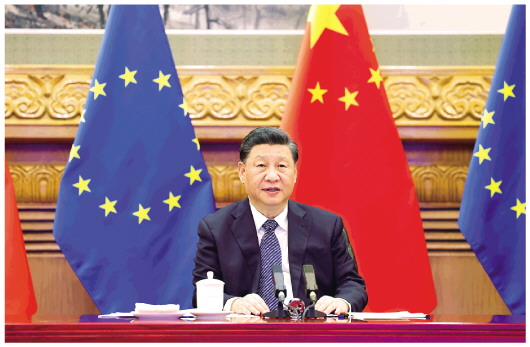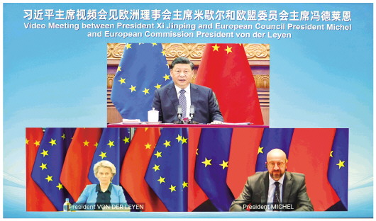 习近平指出,中欧要做促进共同发展的两大市场,以中欧开放合作推进经济全球化深入发展。中国将坚定不移深化改革、扩大开放,欢迎欧洲企业来华投资兴业,希望欧方为中国企业赴欧投资发展提供公平、透明、非歧视性的环境。双方要加强发展战略对接,探索中国新发展理念、新发展格局同欧盟“开放性战略自主”经贸政策的契合点。