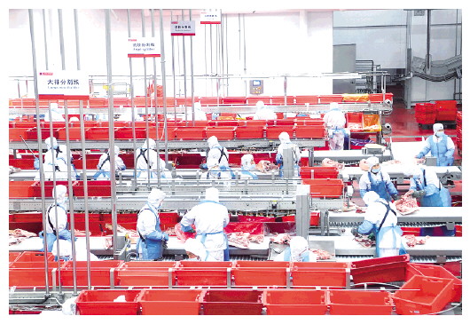 3月15日,在双汇工业园生产车间,工人在流水线上作业。