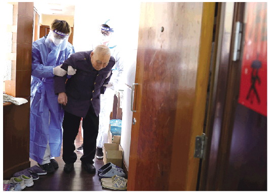 ▲4月4日,志愿者陈洪(左)协助87岁的虞祖荣老人出门检测核酸。在上海市普陀区锦绿新城居民区的1600余户居民家庭中,有不少空巢老人。居住在同一小区内的疫情防控志愿者纷纷行动起来,为老人们跑腿送餐、协助核酸检测、上门保洁、提供心理咨询。非常时期,这些每天上门服务的志愿者,为空巢老人带来一缕温馨,缓解了他们的焦虑恐慌。 新华社记者陈飞摄