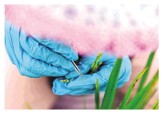 青岛海水稻研究发展中心工作人员在南繁科研育种基地开展水稻杂交工作(4月1日摄)。